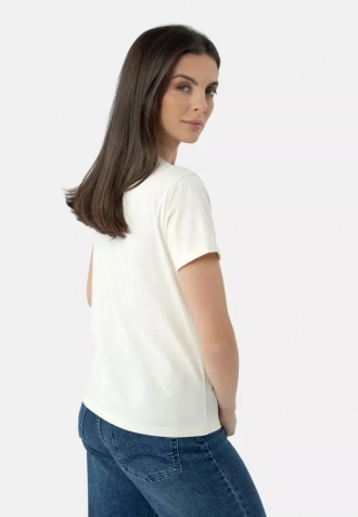 Krémové dámské tričko je lehké a prodyšné. Je to zásluha bavlněných vláken, která jsme použili k jeho ušití. Toto bavlněné tričko má volný spodní lem a střih Regular, díky čemuž padne prakticky každé postavě.