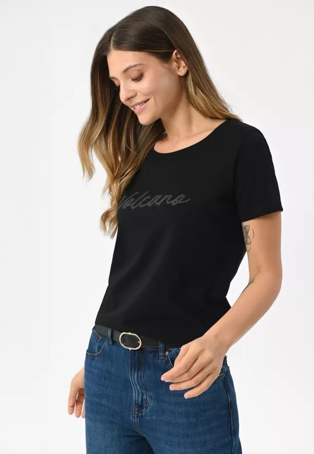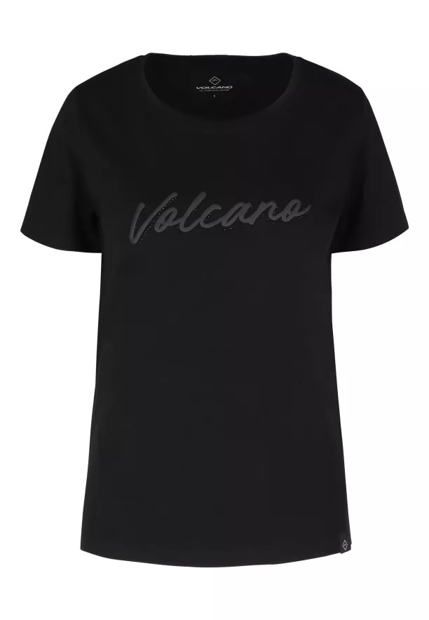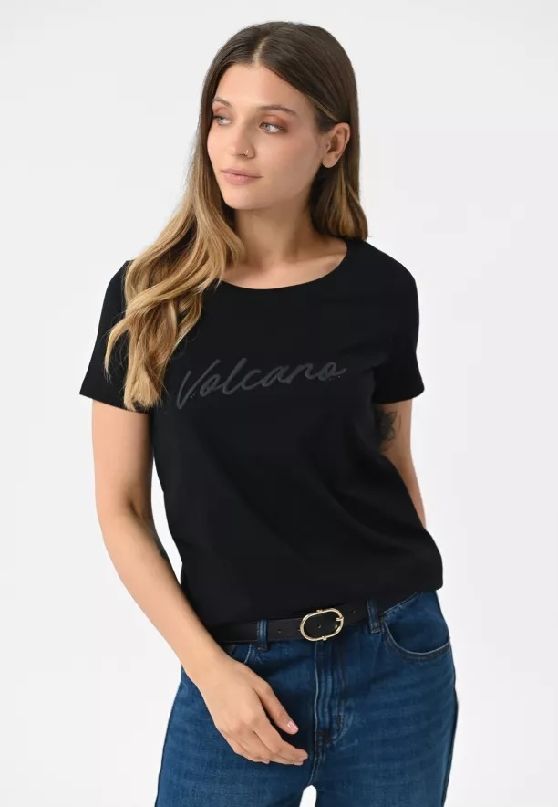 Přední stranu trička zdobí nápis Volcano, obohacený lesklými kamínky, díky čemuž celek získává výjimečný charakter. Klasický krátký rukáv a přírodní, masivní materiál dělají z něj ideální volbu jak k džínům a teniskám, tak k více ženským setům se sukní nebo sakem.
