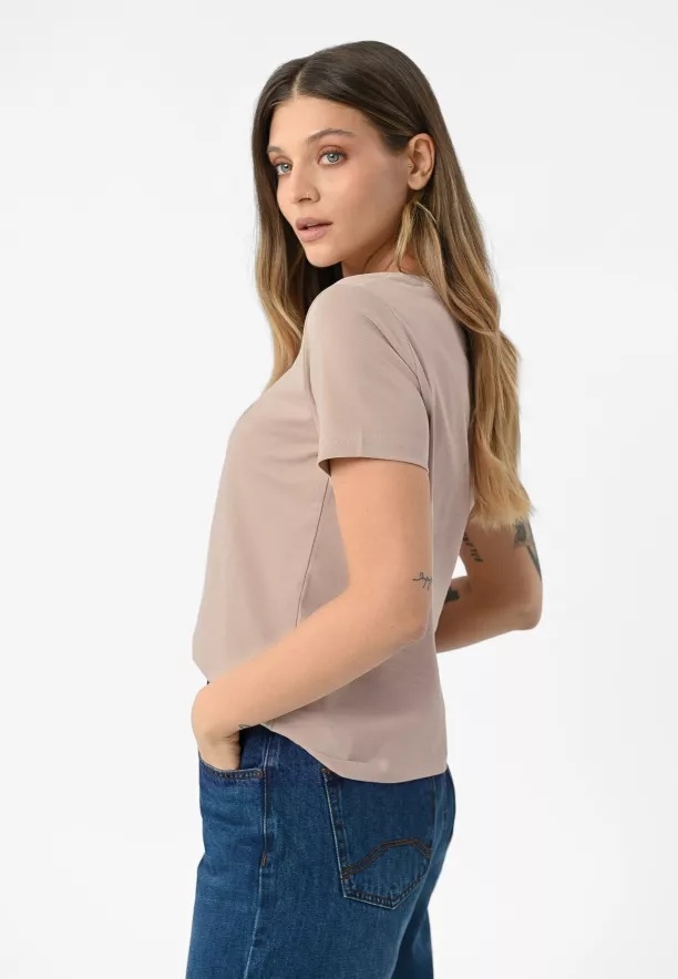 T-PARSLEY je stylové a pohodlné dámské tričko vyrobené z bavlny s gramáží 200 g/m². Béžové tričko je návrh, který kombinuje komfort nošení s moderním designem. Volný střih Regular Fit a půlkulatý výstřih zakončený žebrovaným lemem zajišťují, že tričko skvěle padne na postavu a hodí se k mnoha každodenním outfitům.