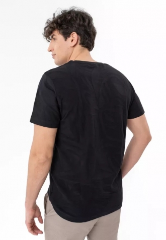 Pánské tričko v černé barvě představuje solidní základ každodenního šatníku pro muže. Jeho hlavní předností je unikátní strukturovaná pletenina s vypouklým motivem listů, která celku dodává moderní a charakteristický vzhled. Zároveň zůstává diskrétním kouskem, který lze snadno kombinovat s dalším oblečením. Klasický střih typu Regular Fit s krátkým rukávem a kulatým výstřihem zaručuje naprostou svobodu pohybu a optimální přizpůsobení postavě bez zbytečného obepínání.