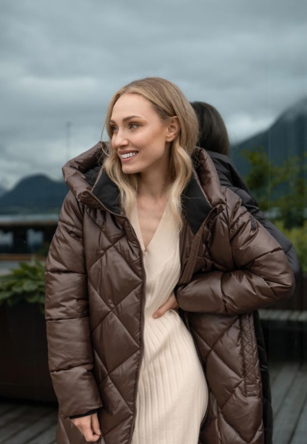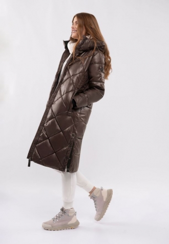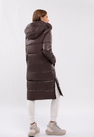 J-FIORDA je pohodlný dámský kabát pro zimní dny. Hřejivý kabát v čokoládové barvě má ozdobné prošívání a kapuci s vysokým límcem, která je navíc lemovaná hřejivým fleecem. Vysoký stojatý límec a dlouhý rovný střih poskytují ochranu před chladem a větrem, stejně jako pletené vnitřní žebrované manžety. Kvůli rovnému střihu tohoto zimního kabátu se naši návrháři rozhodli přidat boční zipy, které se zapínají na patentky. Ty spolu s volným spodním okrajem umožňují nastavení šířky a volnost pohybu.