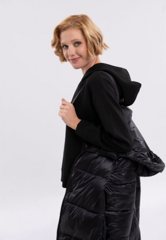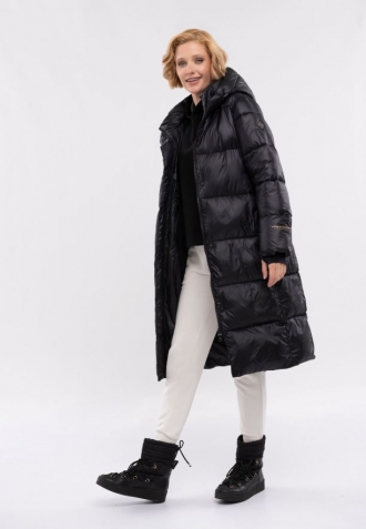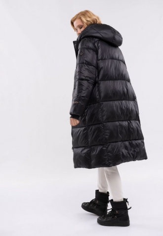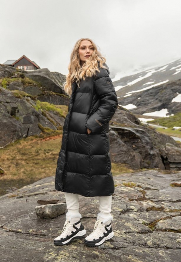 Zimní kabát J-MACADAMIA v černé barvě má rovný dlouhý střih, který nabízí volnost pohybu. Jedná se o teplý kabát, který má široké prošívání nejen pro moderní design, ale také drží polyesterová vlákna na svém místě a zaručuje tak tepelnou izolaci. Neodnímatelná kapuce s vysokým límcem poskytuje dodatečnou ochranu před větrem a chladem, zatímco vnitřní stahování kapuce umožňuje dokonalé přizpůsobení.