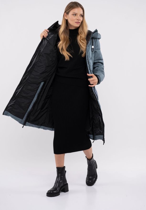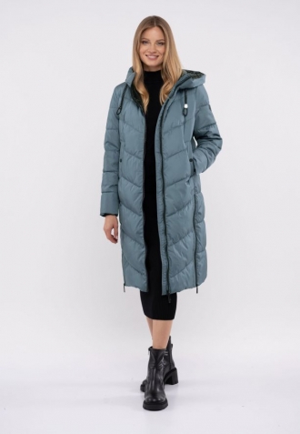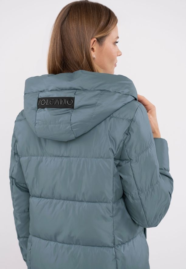 Dámský zimní kabát Volcano má v horní části vysoký límec, který dobře chrání krk před chladem. Široká kapuce (černá a lesklá z vnitřní strany) má na boku funkční šňůrky, které umožňují polohování kapuce a límce podle individuálních preferencí. Kabát je opatřen prošíváním, tj. diagonálním prošitím, které udržuje výplň na místě a zároveň opticky zeštíhluje siluetu.