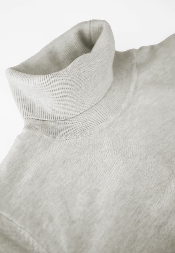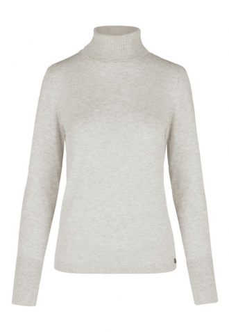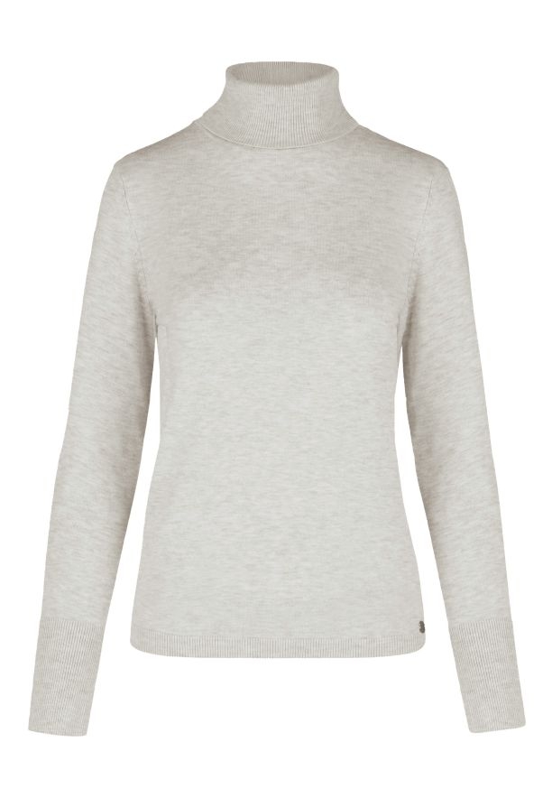Šedý svetr s rolákem má přiléhavý střih a podtrhuje postavu. Rukávy jsou zakončeny širokými, žebrovanými manžetami. Celý střih je jednoduchý, elegantní a doplněný bižuterním detailem Volcano.