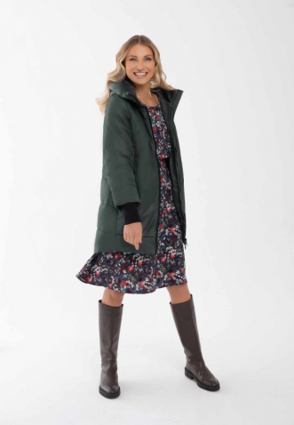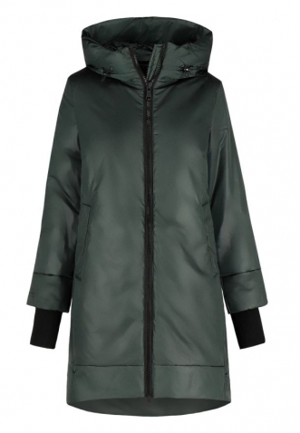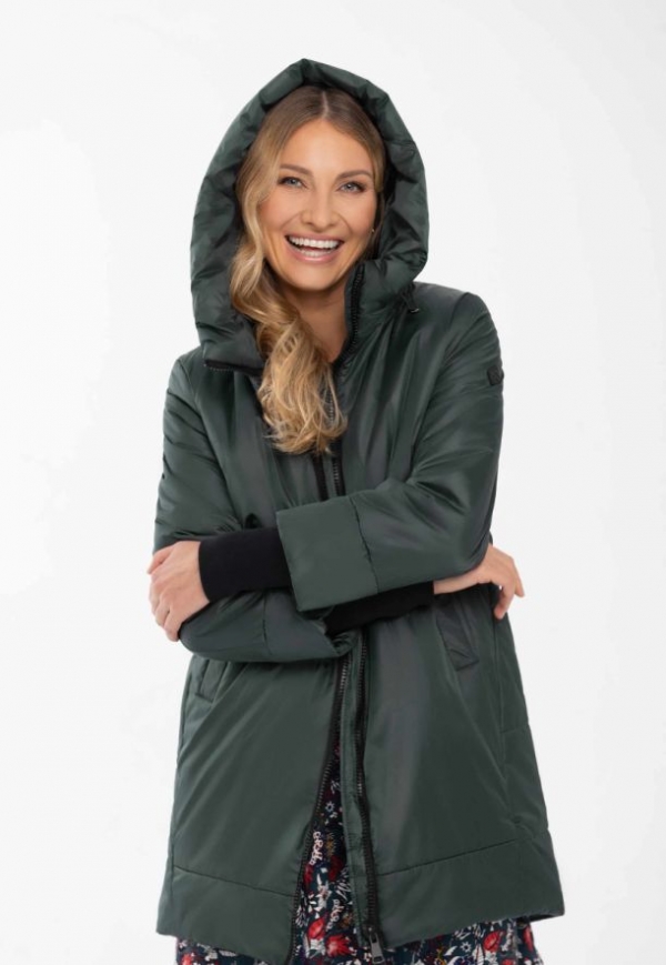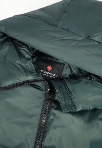 Zelený zimní kabát pro ženy, které ocení jednoduchý střih a pohodlí. Tento model s prodlouženým zadním dílem je ušitý z hladké lesklé látky, bez výrazných ozdobných prvků. Zdobení najdete pouze na kapuci a levém rukávu, kde je umístěn decentní černý nápis Volcano. I přes jednobarevnost má kabát výrazný charakter a umožní vám vystoupit z davu.