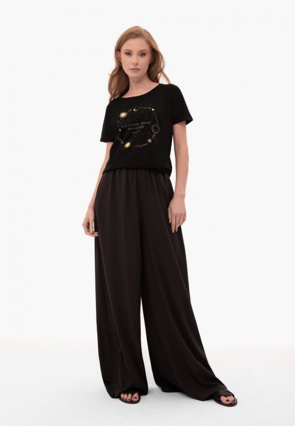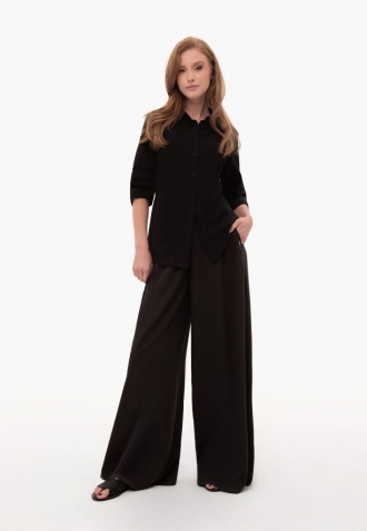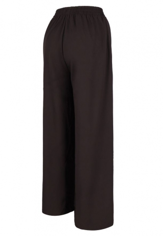 Dámské kalhoty s širokými nohavicemi se ideálně hodí pro jarní a letní období. Tvoří základ jak pro ležérní, tak pro sportovní stylizace. Vše záleží na vybraných doplňcích. Grafitové, letní dámské kalhoty mají dvě kapsy vpředu.