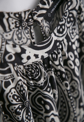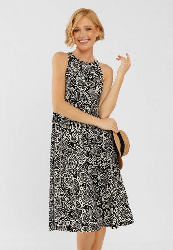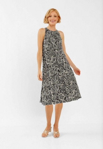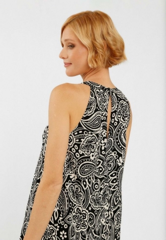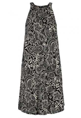 Tyto efektní šaty s černo-bílým vzorem paisley jsou ušité ze 100% viskózy, díky čemuž jsou mimořádně prodyšné a příjemné na dotek. Volný, lehce rozšířený střih skvěle sedí na postavě a zajišťuje volnost pohybu. Výstřih typu halter dodává šatům ženský charakter a rozparek vzadu, zapínaný na knoflíky, plní jak praktickou, tak dekorativní funkci.
