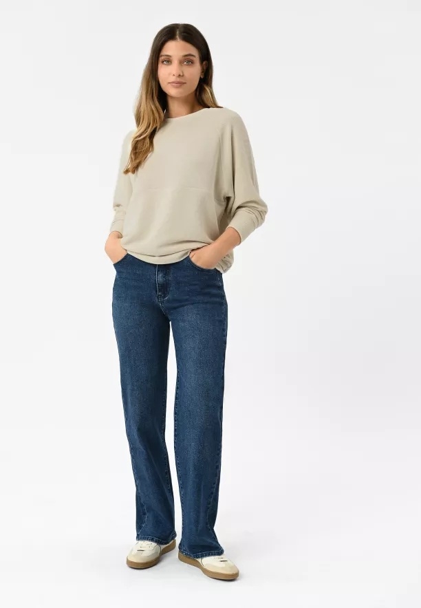 Dámská žebrovaná mikina má volný střih a netopýří rukávy, díky čemuž je mikina volná a neomezuje v pohybu. Dá se říci, že má oversize střih, což znamená pohodlí a komfort při nošení. Je to ideální mikina pro každodenní nošení. Půlkulatý výstřih s lemem dodává eleganci a spodní lem a manžety zakončené lemem zajišťují dokonalé padnutí.