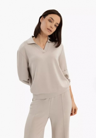 Dámská mikina B-NALIA je mikina v casual stylu. Vyznačuje se volným střihem a výstřihem do V zakončeným límcem. Mikina s tímto zakončením opticky prodlužuje krk a zeštíhluje horní část těla. Límec navíc dodává mikině elegantnější charakter, díky čemuž je ideální do práce i do kanceláře. Mikina s límcem a v-neck výstřihem se skvěle hodí i pro vrstvení. Pod sakem nebo kardiganem dodává outfitu upravený vzhled a výstřih do V zabraňuje dojmu těžkopádnosti.