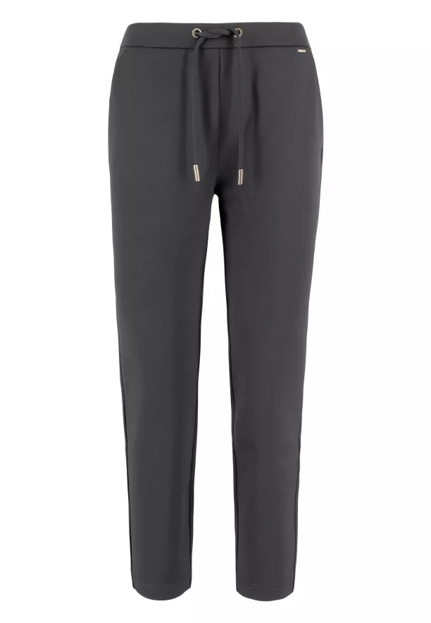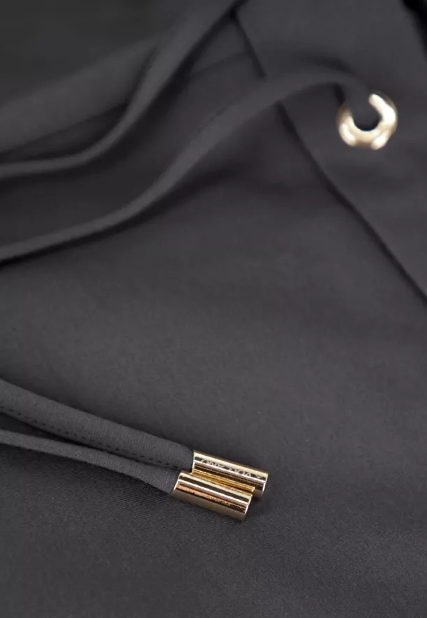 Kalhoty mají volný střih. Pro větší pohodlí jsme na přední stranu zařadili dvě nakládané kapsy, do kterých se vejdou klíče nebo kapesník. Poskytují také dostatek prostoru pro ruce. Kalhoty zdobí pozlacené detaily na šňůrce v pase.