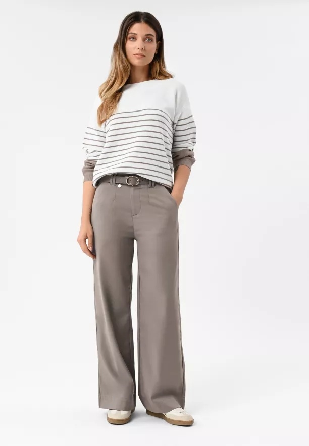 Kalhoty, které jsou ideální? Ano - dámské kalhoty R-HUS! Tyto látkové kalhoty můžete s úspěchem obléknout do práce, stejně jako na společenské nebo kulturní setkání. Kalhoty s širokou, volnou nohavicí jsou přiléhavé v pase a zapínají se na zip a háček. Abychom je ještě lépe přizpůsobili pasu, přidali jsme do kompletu elegantní pásek. Tyto kalhoty střihu wide leg jsou must-have ve Vašem šatníku.