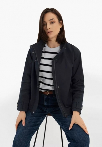 Krátká dámská bunda J-MELBA je kvintesencí sportovní elegance. Má ležérní stojáček a elegantní kovový zip, který je diskrétně skryt pod légiou na druky. Její rovný, volný střih lze upravit pomocí vnitřní stahovací šňůrky ve spodní části. V takovém případě získáme uvolněnou, lehce podkasanou bundu. Celek doplňuje jemný odstín béžové, který podtrhuje klasický střih a univerzálnost bundy. Právě tato nadčasovost a praktické detaily umožňují její snadné kombinování jak s elegantními prvky, tak s typicky ležérními kousky. Lehká, tmavě modrá bunda J-MELBA je ideální volbou pro proměnlivé březnové nebo dubnové počasí.