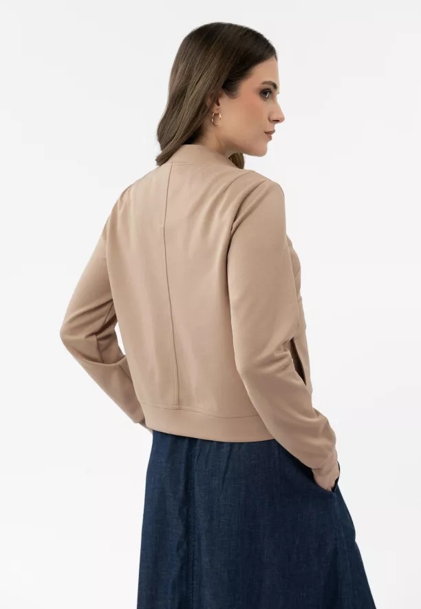 Tato dámská bunda-mikina je spojením pohodlí a moderního stylu. Svým střihem odkazuje na bundy typu bomber. Krátká, béžová bunda byla ušita z hladké tkaniny – směsi viskózy, polyesteru a elastanu. Přírodní viskózová vlákna zajišťují, že je materiál prodyšný a měkký, zatímco příměs polyesteru a elastanu zaručuje odolnost a pružnost, díky čemuž se bunda skvěle přizpůsobí postavě, aniž by omezovala v pohybu.