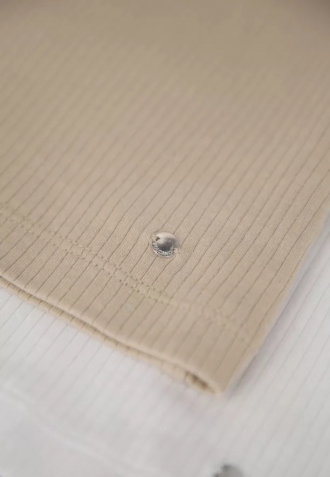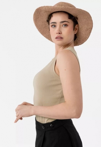 Univerzální dámské tílko na širokých ramínkách. Tílko je ušito z módního žebrovaného materiálu a má béžovou barvu. Střih Slim-Fit a jednotná barva umožňují top nosit jak samostatně, tak i pod sako, mikinu nebo svetr.