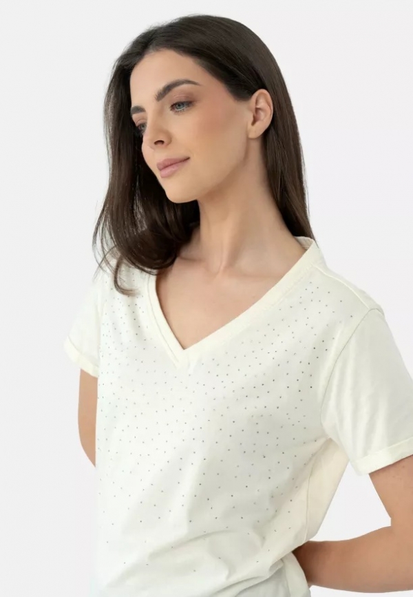 T-MELI je dámské tričko s krátkým rukávem. Má klasický střih, ohrnuté manžety rukávů a co je nejdůležitější, našité kamínky na přední straně. Jsou stříbrné, díky čemuž tričko decentně zdobí a dodávají mu jemný lesk. Takové tričko lze nosit samostatně, ale i pod sako nebo například džínovou bundu. Úspěšně ho můžete kombinovat také s látkovými kalhotami nebo sukní jakéhokoli střihu.