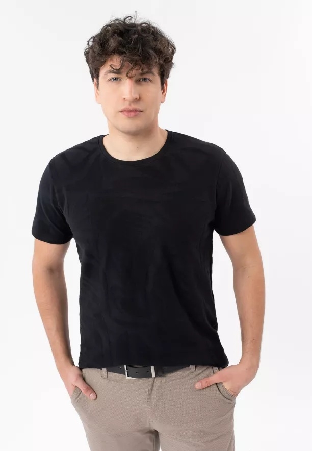 Pánské tričko v černé barvě představuje solidní základ každodenního šatníku pro muže. Jeho hlavní předností je unikátní strukturovaná pletenina s vypouklým motivem listů, která celku dodává moderní a charakteristický vzhled. Zároveň zůstává diskrétním kouskem, který lze snadno kombinovat s dalším oblečením. Klasický střih typu Regular Fit s krátkým rukávem a kulatým výstřihem zaručuje naprostou svobodu pohybu a optimální přizpůsobení postavě bez zbytečného obepínání.